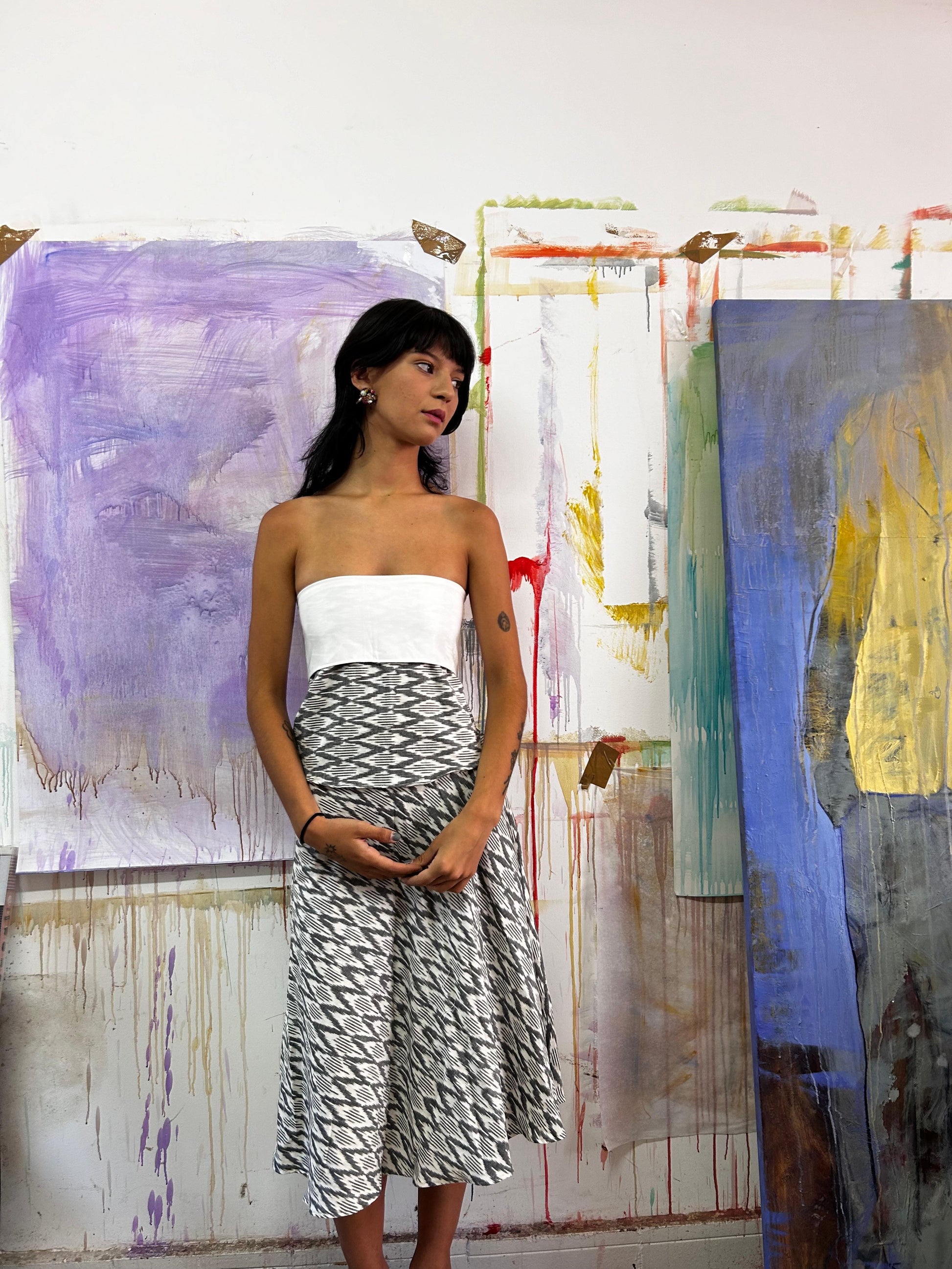 Falda midi tipo pareo con cinturón ajustable y top al sesgo con amarra ajustable en la espalda. Este conjunto es parte de nuestra colección de diseños multitallas los cuales se adaptan a distintas tallas.